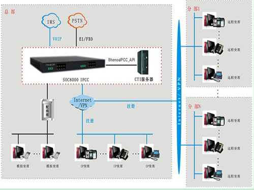 7、支持远程IP座席部署,适用分布式呼叫中心组网